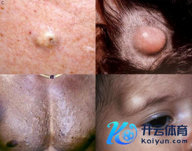 左上是表皮样囊肿;外毛根鞘囊肿(右上)多发生于头皮;皮样囊肿(右下)为先天性的,常见于前囟、前非凡侧眉毛处;多发性脂囊瘤(左下)多发于胸部,阐发为多发的肤色小结节。