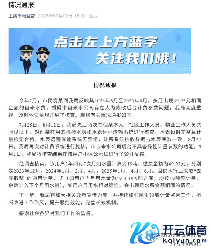 本年7月,市民倪某到我局响应其2023年6月至2025年6月,多月出现49.93元调换金额的自来水费,质疑市自来水公司存在东说念主为修改后台计费参数问题。我局高度醉心,实时照章依规开展了核查。现将相关情况通报如下。